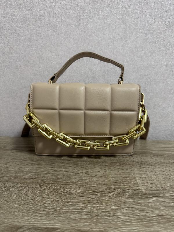 Жіноча сумочка в бежевому кольорі. Вмістка. Має знімний ланцюжок. Регулюючий ремінь.