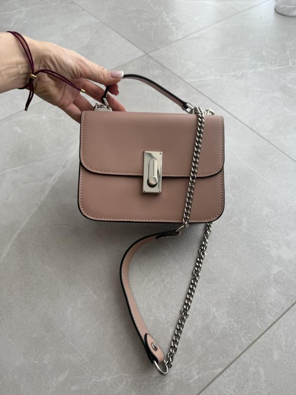 Продам сумочку в крутом цвете пудры. Имеет две ручки, маленькую и пасок из цепочки. Имеет небольшой дефект, царапину в коже, но при закрытом состоянии не заметно. Лишь когда открываете сумочку Размеры :ширина 19,5*длина 16*глубина 7 Длина ручки длинной 54 см