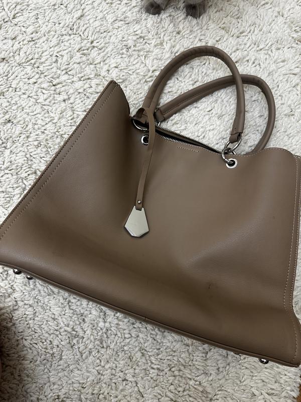 Состояние: приемная, но в хорошем виде (отвратите внимание на мелкие следы использования, которые видны лишь при близком рассмотрении). • Материал: качественная экокожа, мягкая и приятная на ощупь. • Цвет: бежево-коричневый (нейтральный, подходит к любому гардеробу). • Фурнитура: серебристая, придает элегантность и современный вид. • Размер: достаточно просторная, чтобы вместить все необходимое — документы, косметику, телефон и прочее. • Особенности: удобные ручки для ношения в руке и стильный минималистичный дизайн.