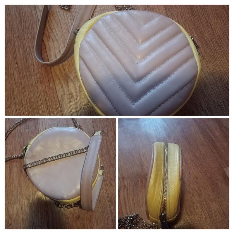 Кожаная круглая сумка,1 отделение, есть карманчик.Размеры-диаметр 17, углеродина 6,высота ручки 60см