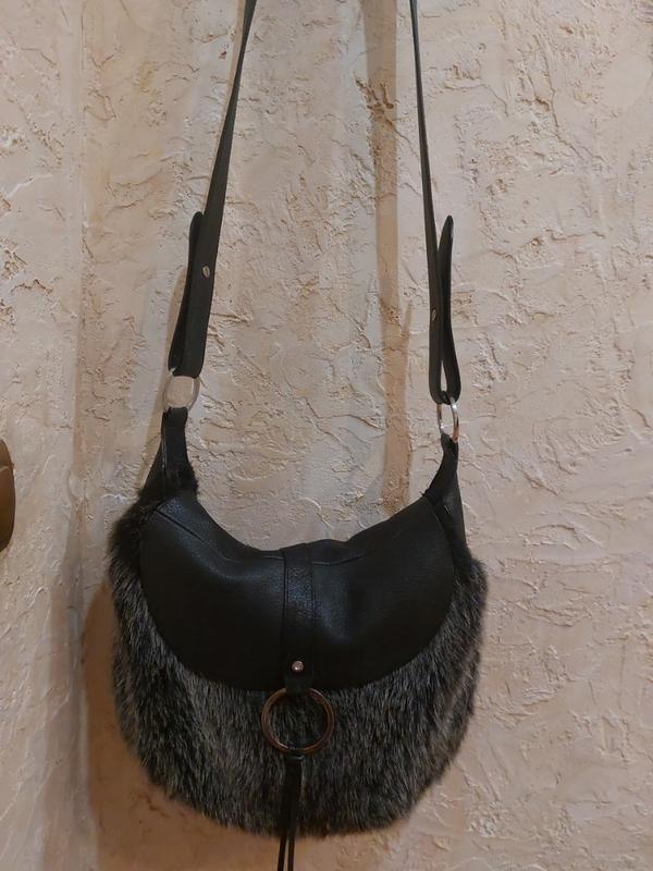 сумка, выполненная из искусственного меха, искусственная кожа, застегивается на кнопку, одно отделение, кармашек на молнии, размер 0.30× 0.36 см. длина ручки регулируется.