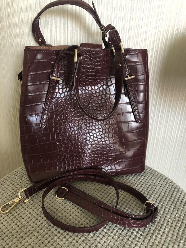 Класна сумка-тоут з імітацією шкіри крокодила в актуальному бордовому кольорі від Zara. Є довгий ремінець