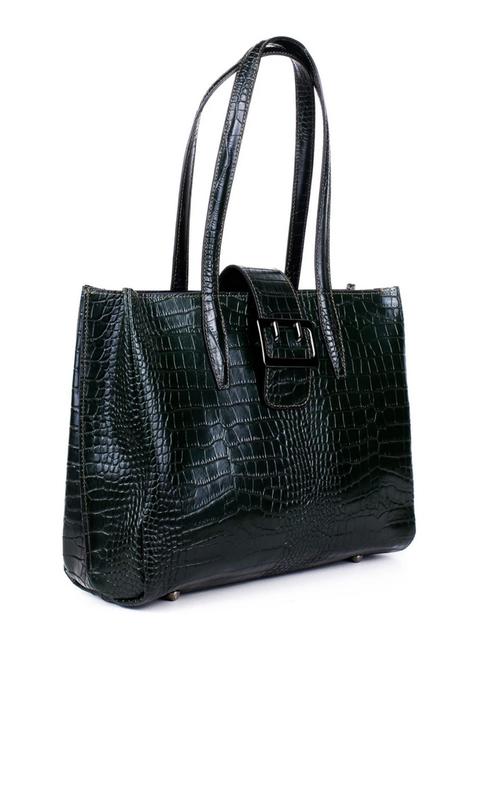 Кожаная сумка с фактурой крокодила Размер 27х36х13 Страна производитель: Италия С двумя ручками на металлических ножках Внутри 2 отделения +1 на молнии Цвет темно-зеленый Новая, с биркой