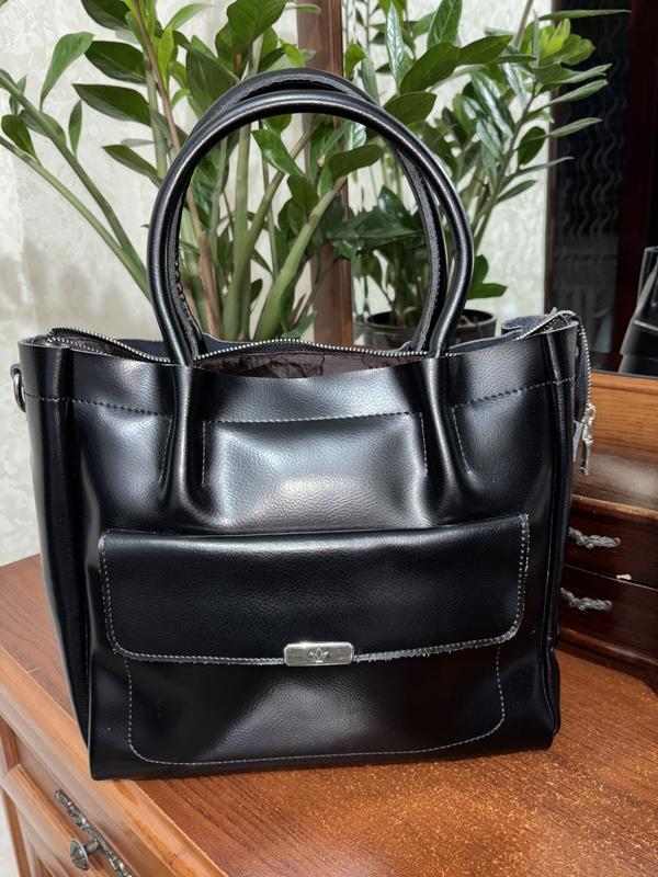 Черная кожаная сумка, довольно вместительная, имеет 2 завивочные карманы