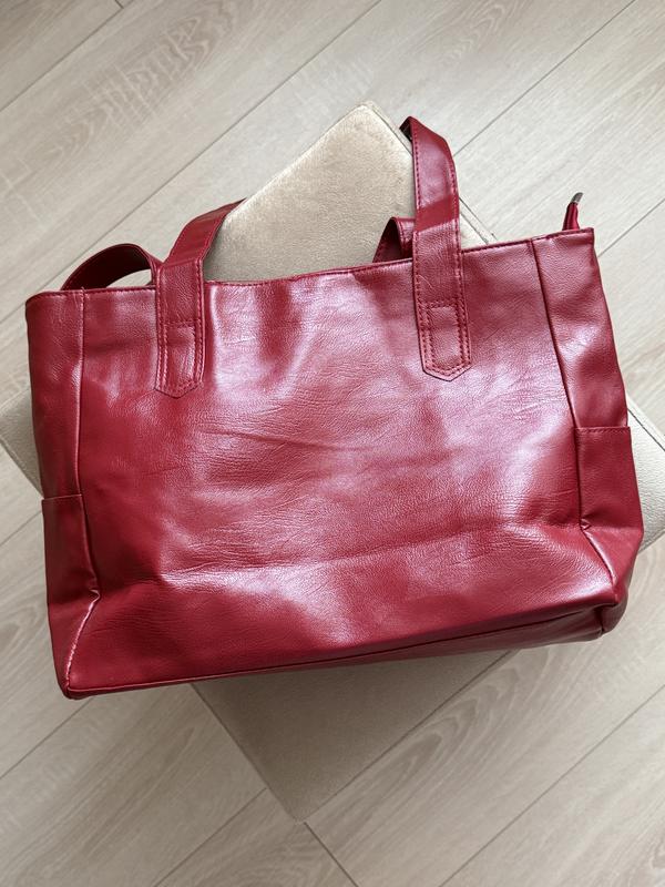 Сумка в красивом бордовом цвете, очень вместительная Из эко кожи, производитель Китай Ширина 33 см Длина 25 см Глубина 23 см Имеет два маленьких кармана один с замком другой нет Длина ручек 63 см