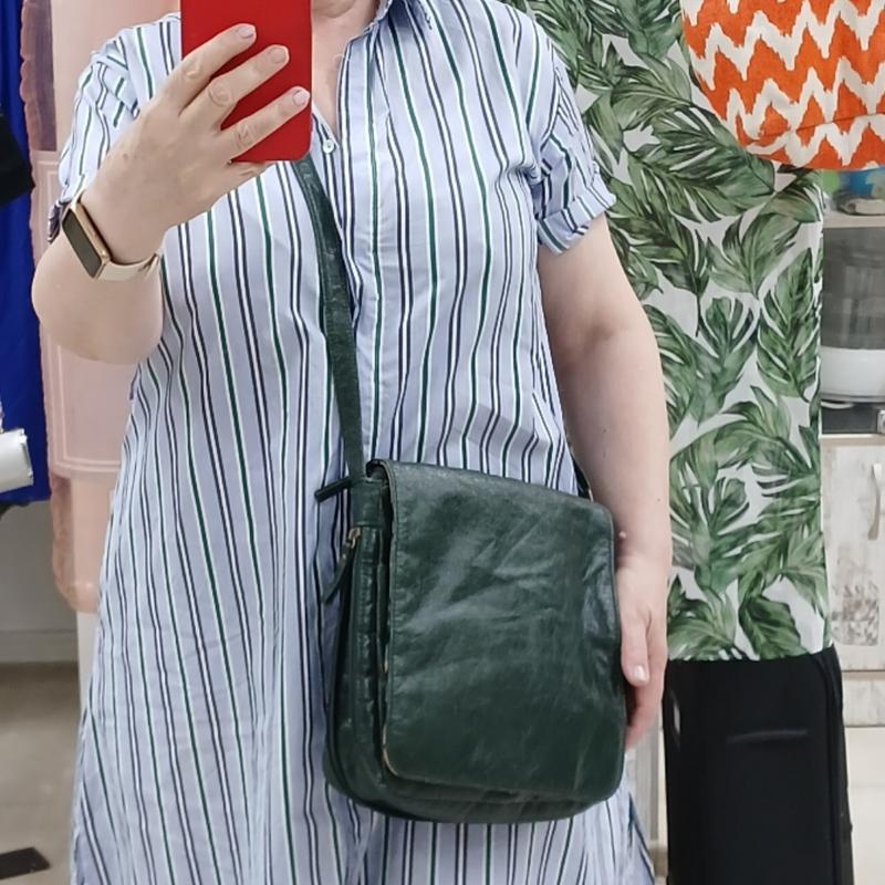 небольшая, но вместительная сумка-почтарь темно-зеленого цвета на длинном ремешке, которой регулируется. Имеет карман на липучки, карман на обратной строне на молнии и всредние дополнительные карманы.