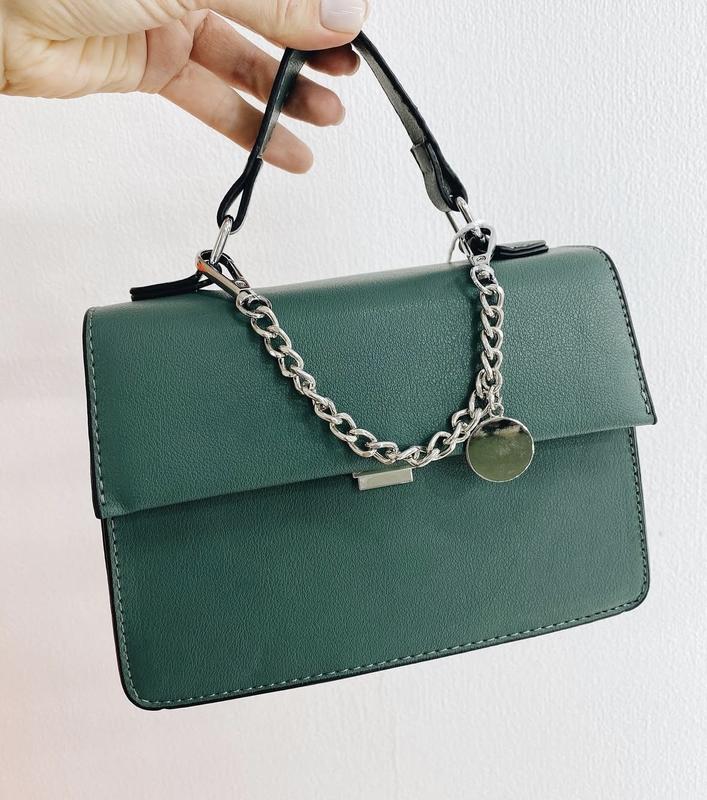 Сумочка темнозеленого кольору в комплекті з ланцюжком. Всередині два відділення (якщо потрібно скину додаткові фото). Є один маленький дефект, показую близько на останньому фото. Розмір: 21х15.