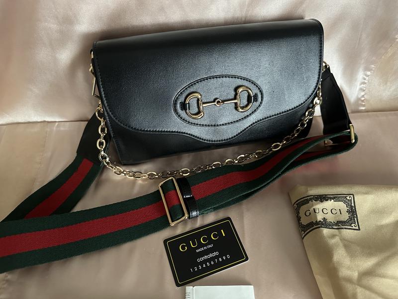 Жіноча сумка в стилі Gucci Horsebit Black, чорна Розмір 26 х 16 см. Усередині одне відділення. Підкладка в сумки зі щільного та якісного текстилю, світла. Основний ремінець з металлу, додатковий ремінець зі щільного зелено-червоного текстилю, регульований. В наявності пильник та паспорт. Подробиці за запитом.