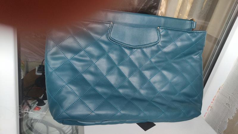 Новая вместительная сумка темно зеленого глубокого цвета, без замка на магните, и длинный ремешок(~115 см). Материал кожзам, есть небольшой дефект( указала на фото,не заметен)