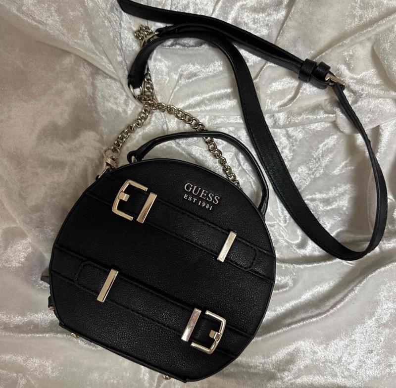 Можливий торг ! Жіноча сумка Guess Jori Round Колір - чорний , матеріал - еко шкіра розмір - до 25см довга сторона (маленька) Габарити (ДхШхВ) - 17х15х7 см Стан 9/10 маленькі дефекти видно на останньому фото