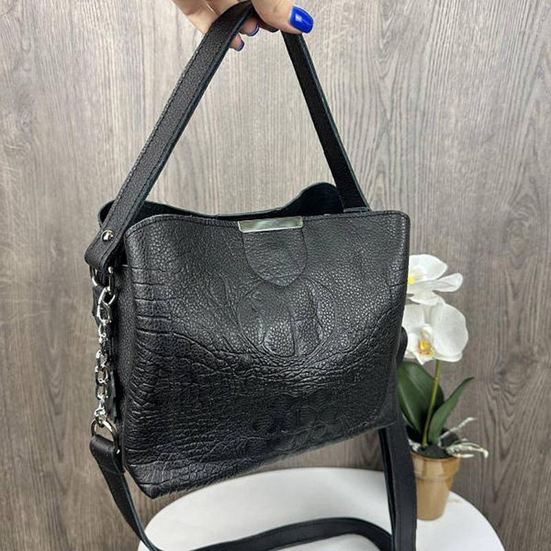 Женская кожаная сумка черная рептилия, сумочка из натуральной кожи крокодил тиснение черны...
