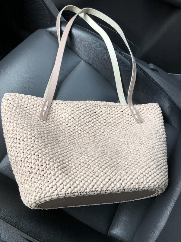 Виконана з рафії та шкіряне дно з ручками. Дуже легенька та комфортна .