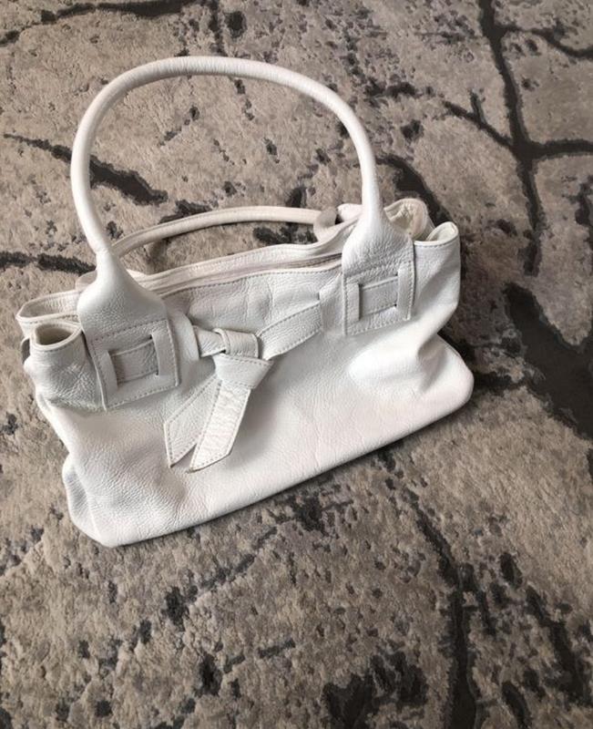 Дуже якісна розкішна шкіряна сумка фірми Genuine Leather білого кольору. Ширина - 36 см, висота - 22 см, дно - 30x11 см, ручки - 21 см. Шкіра зерниста та щільна, чудової якості. Сумка застібається на блискавку, в середини2 основні відділення та 2 кишені на блискавці.