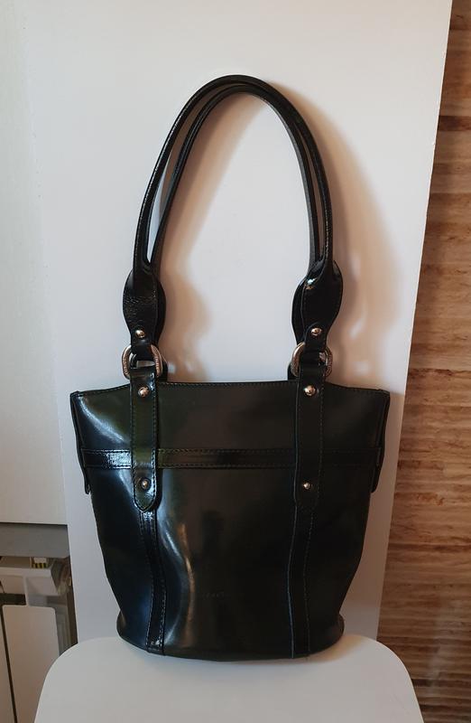 сумка из натуральной кожи лакированная,производство Франции, известного французского бренда Freberic Paris, с круглым дном, форма трапеция, закрывается на молнии, имеет одно большое отделение с внутренним карманчиком на молнии и с оборотной стороны сумки тоже отделение на молнии. по всей фурнитуре присутствует логотип бренда. Размер высота 25,ширина внизу 27см, вверх 31см,дно 21 на 14см