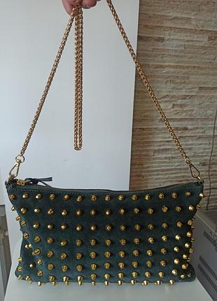 красивая сумочка из мягкой комбинированной кожи ( гладкой и замши) декорирована металлическими шипами. Размеры: высота 19см, ширина 31 см, длина цепочки 118см.