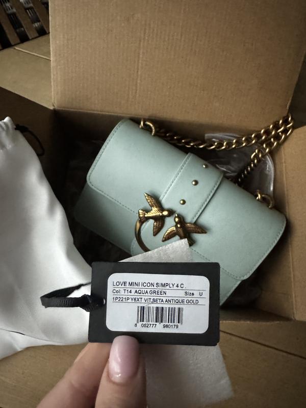 Сумка пінко в приємному кольорі тіфані , модель love mini icon , була в носці мінімально, повне пакування, стан ідеальний всередині та ззовні,провірку на оригінальність пройдена чіпом