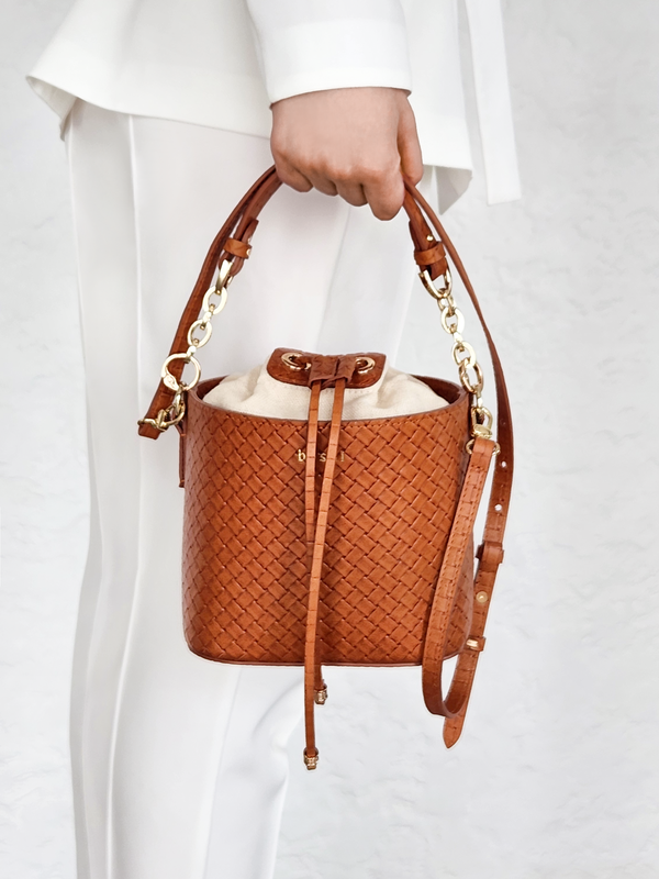 Жіноча сумка з натуральної шкіри, фурнітурою з гальванічним покриттям. Тверде дно/стінки сумки дозволяють виробу тривалий час зберігати свою форму. Модель оснащена металевими ніжками для захисту дна сумки. Внутрішній простір сумки: одно відділення, одна накладна кішеня. Знімний мішечок з натурального льону, який стягується шнурками. Регульований знімний ремень. Довга знімна ручка з ланцюжками. В комплект також входить атласний мішок для зберігання. Модель: Bucket bag Caramel Розмір: 18×16×13 Плечовий ремінь: 100 см Ручка з ланцюжками: 40 см Колір фурнитури: золото Матеріал верху: натуральна шкіра з тисненням плетіння Матеріал мешка: натуральний льон Матеріали підкладки: штучна шкіра Колір: карамель