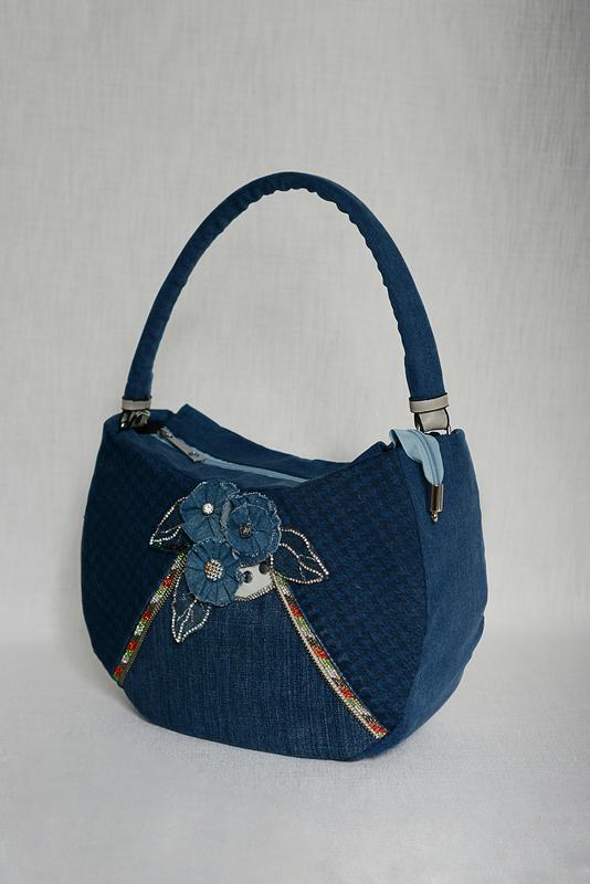 Сумка из джинсовой ткани с кожаной вставкой и стразовой лентой. Цветочки – из джинсовой ткани, украшенные стразами. Застежка молния. Имеет одно отделение и два кармана - один на молнии и один открытый. В середине – подкладочная ткань черного цвета. Сумка с уплотнителем. Крепкая ручка с джинсами для ношения в руках или на плече. Ширина 30 см, высота 20 см, глубина 12 см. Высота ручки 23 см.