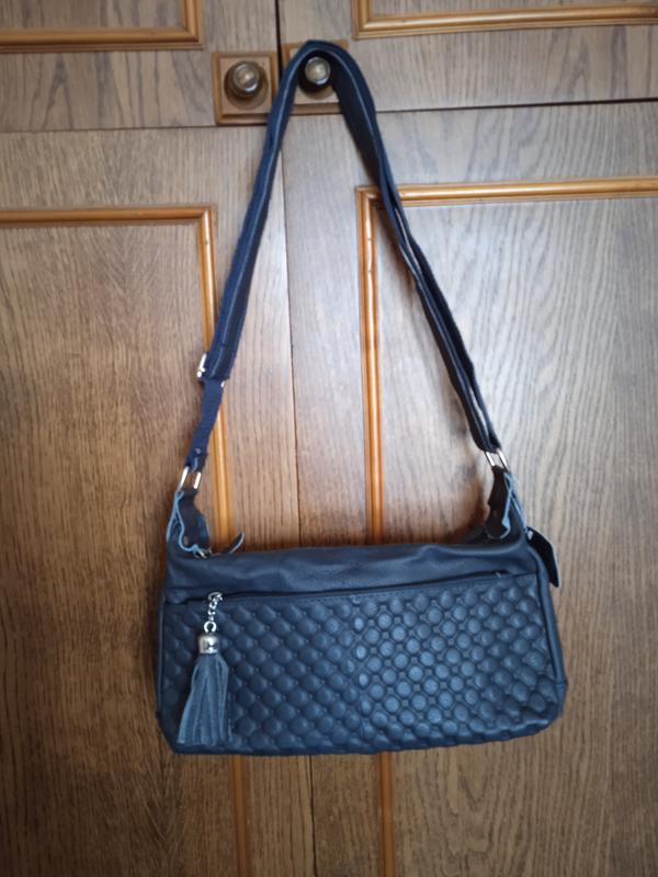 Новая, натуральная кожа, цвет темно-синий, размеры 31х18х9(см), 2 основных отделения+2сторонних, длина ручки регулируется.