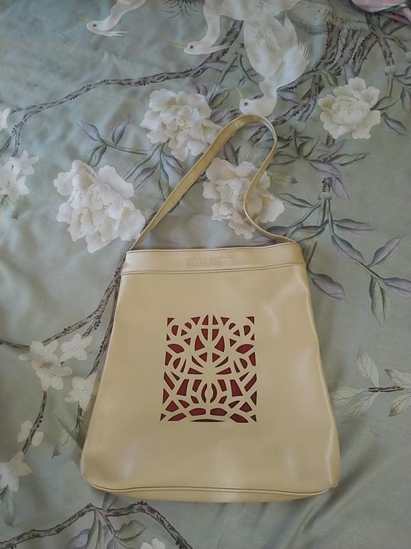 небольшая летняя сумка, цвет бежевый, подкладка красная, застежка кнопка, не секонд, материал синтетический но качественный, размеры: 29*27*5, длина ручки 58.