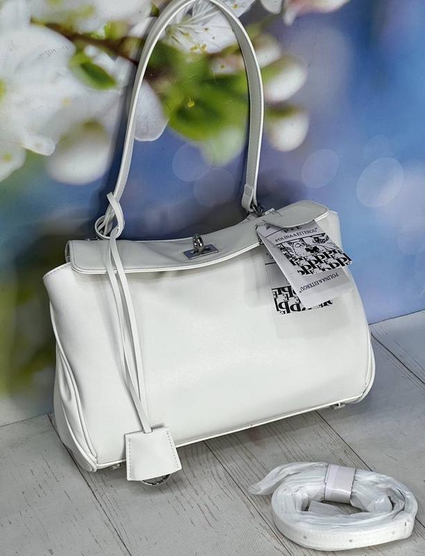Наличие уточняйте Кожаная сумка в стиле бренда, средний размер Цвета: белый, молочный Натуральная кожа 26/16/6см, На застежке, внутри два отдельных отделения, карманы. Снаружи сзади два открытых кармана Металлические ножки Коротка ручка на плече Длинный регулируемый ремешок