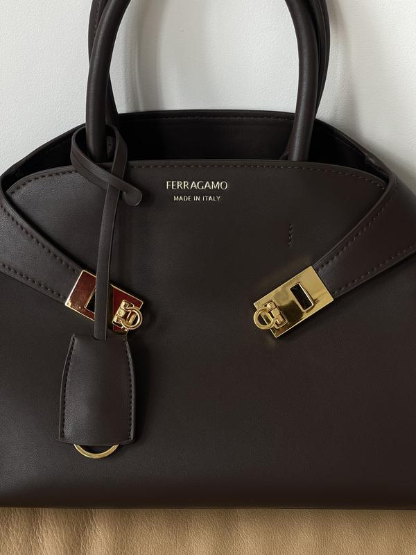 ОТРИМАЛИ В КІЛЬКОСТІ 🤍 Бренд Ferragamo основан во Флоренции в 1927 году, и Ferragamo стал мировым лидером в сфере роскоши. Сумка выполнена из гладкой кожи. Внутри одно отделение, один внутренний карман на молнии, съемный аксессуар – кольцо для ключей, декор застежки с замком Gancini. Подкладка у сумки из черной кожи, в середине тиснения логотипа. Додатково прикрашена брелком. Фурнитура металлическая в золоте. Имеет ручку для носки в руке и узкий ремешок с регулируемой длиной для ношения через плечо. Размер: 31*22*16см Материал: кожа Максимальная длина широко ремня 120см ⭐️ Пильовик в комплекті