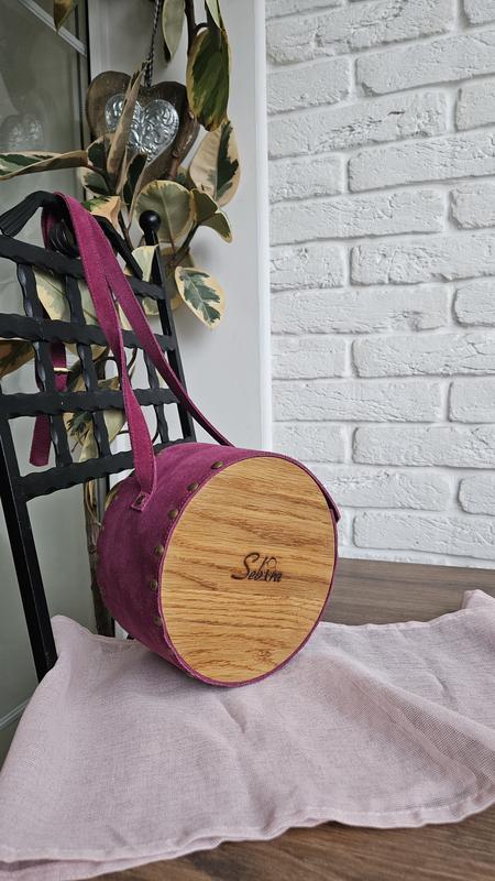 Очень оригинальная и качественная сумка от крафтовой украинской мастерской. Материалы-замш и дерево. Диаметр -20 см, ширина-11 см. Состояние новой вещи. Купила и в восторге от этой вещи, но, к сожалению, не подходит к своему стилю и гардеробу. Цена- 1700 грн. Ирпень, УП, НП.