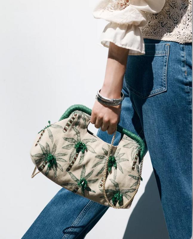 Сумочка-клатч. Вышивка и бисер снаружи. Две жесткие ручки и съемная цепочка на плечо. Магнит и рамочная застежка. Высота x длина x ширина: 12.5 x 31 x 7.5 см.