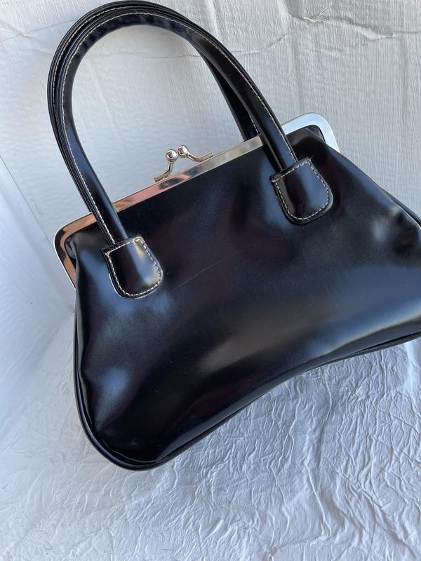 Красивая классическая сумочка на застежке. Имеет две ручки, без тягового ремешка. Идеальное новое состояние. Внутри же карман на молнии. Длина ручек -15см, замер от центра сумки вверх; Высота - 14см; Ширина - 23см
