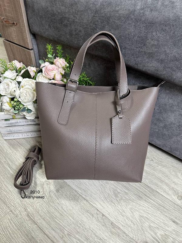 Код 2010 🔸Велика містка сумка. 📚Формат А4. 🔸Укр.фактурна еко.шкіра. 🔸Ширина знизу 28 см,ширина зверху 40 см., висота 28 см, дно 12 см.Ручки регулюються до 19 см,ремінець до 139 см. 🔸Всередині одне велике відділення, бічні кишені.