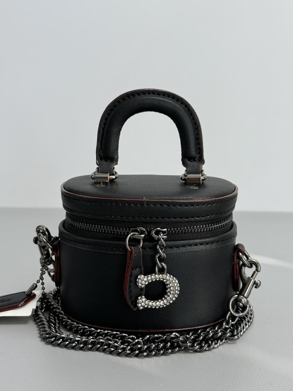 • Размеры: 11 × 9 × 7 см • Материал: Гладкая эко-кожа • Цвет: Черный с бордовой отделкой • Фурнитура: Серебристая, подвеска в виде фирменной буквы “C” с камнями • Закрытие: Молния по кругу • Страна: Китай • Отделение: Одно основное отделение • Ремень: Металлическая цепочка + удобная ручка для ношения в руке • Стиль: Трендовая и компактная. Эта мини-сумочка Coach — выбор для тех, кто любит акценты. Изысканная фурнитура, идеальный формат для самого необходимого и модная форма vanity bag – стильный must-have в твоем гардеробе.