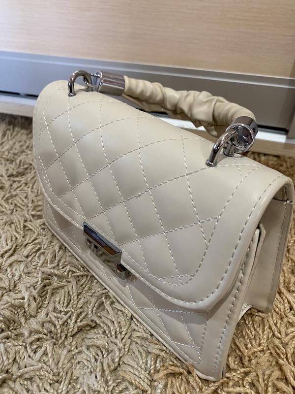 Продам елегантну сумочку у ніжному кремовому кольорі. Актуальний дизайн з декоративною прошивкою Стан: дуже добрий. Є незначний нюанс на ручці (трохи зчухався) , але завдяки зморшеному дизайну ручки він непомітний у використанні.