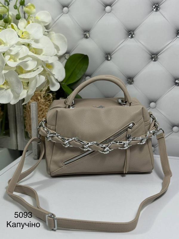 Код 5093 Эко кожа 28х20х11 Одно отделение на молнии, разделенное отделением на молнии. Внутри карман на молнии и карман открытый. На лицевой стороне отделение на молнии. На обороте карман на молнии. В комплекте длинный регулируемый ремень. Украшение (цепочка) съемное.