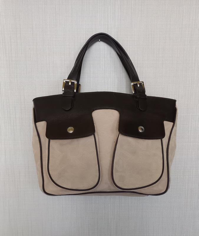 Сумка DKNY текстиль + кожа отличного качества, на три отделения, есть два внешних кармана на кнопках и три внутренних кармана. Размер 32 х 23 см. Дно 30 х 7 см. Бока 23 х 7 см. Длина ручек регулируется максимальная 35 см.