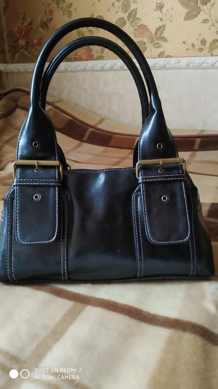 Сумка держит форму, три отделения боковые на кнопке средние на молнии, но есть карман на молнии внутри, содержимое, кожа глянцевая. без царапин и потертостей высота 16сы, длина по низу 30см