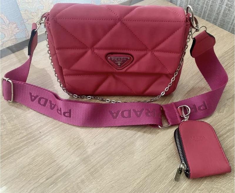 Нова сумка, красивого рожевого кольору, дуже приємна мягка сумка по своїй текстурі, всередині одна загальна кишеня. Довжина ручки регулюється. Виробник Туреччина. Брендування Prada по всій сумці.
