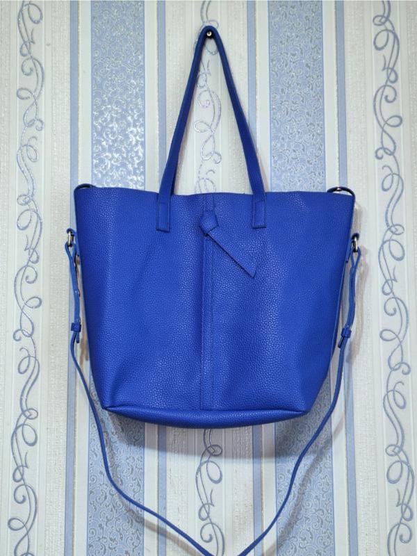 Стильная, вместительная сумка-шоппер ярко-синего цвета. Состояние новой вещи. Имитация итальянской выделки кожи • декоративный хлястик на лицевой стороне • боковые части складываются внутрь, визуально делая сумку компактной • внутри 1 карман на молнии. Закрывается сумка на магнит. РАЗМЕРЫ: сумка: 28/43 см (длина) х 32 см (высота) х 12 см (ширина). плечевой ремень регулируется. длина ручки: 57 см