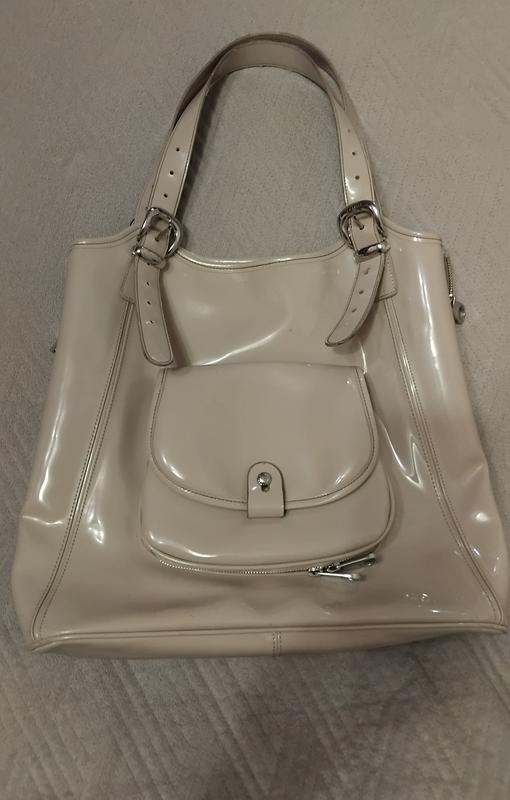 Сумка Ted Baker в хорошем состоянии.. Спереди сумки есть большой карман. По бокам и на переднем кармане замочки для красоты. Внутри сумки одно большое отделение, два открытых кармана и один на молнии. Размер: Высота по центру 36см. Ширина 37см. Глубина дна 16см. Длина ручек 72см, регулируются, есть дырочки