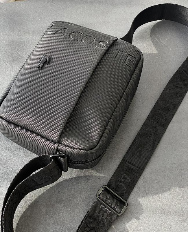 💼 Чоловіча сумка месенджер Lacoste •3301 ▪️Розмір: 22х17 см ▪️Матеріал: екошкіра, металева фурнітура ▪️Колір: чорний 📝 Сумка виготовлена з еко шкіри. Має одне велике відділення, на стінці є додаткова кишеня на блискавці. На лицьовій стороні є ще одна кишеня на магніті. Позаду додатковий відділ на блискавці. Ремінець текстильний брендований, має регулюєму довжину до 100 см. ▪️ Комплектація: брендова коробка Lacoste