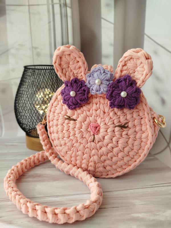 Эта милая вязаная сумочка в виде зайчика - настоящее воплощение нежности и уюта. Она станет идеальным аксессуаром для маленькой модницы или подарком, вызывающего улыбку. Ручная работа, теплые цвета, цветочки с жемчужинками и удобный ремешок - все создано с любовью и заботой о деталях. Материалы: трикотажная пряжа, фурнитура премиум-качества. Размер: диаметр ~17см. Длина ремешка ~74см Возраст: 2+