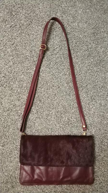 Состояние и качество отличное. В использовании не была, при транспортировке кожа гнулась . Дефектов нет. На лицевой стороне мех натуральный. Длинна ремешка регулируется. Во внутри имеется карман.