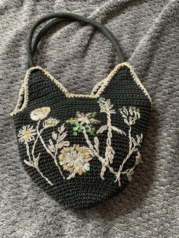 В гарному стані, в’язана і прикрашена вишивкою з паєтками , має одне відділення , і маленьку кишеньку на змійці,застібається на кнопку, красива , рекомендую Висота виробу з ручками разом 40 см Ширина виробу 27 см