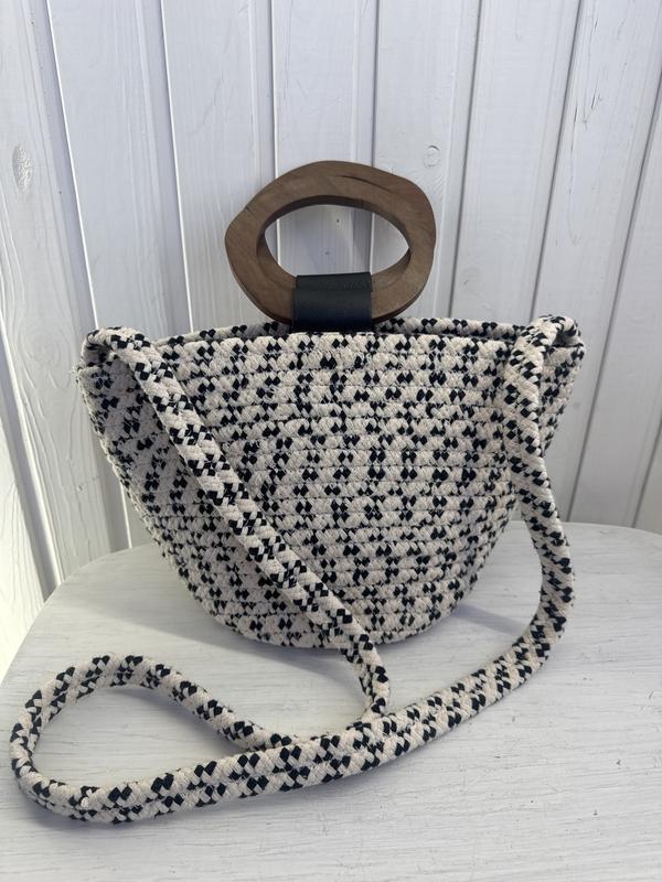 Є в наявності дуже стильна плетена жіноча сумка M&S. Ця сумка через плече з колекції Marks and Spencer стане стильним доповненням до будь-якого образу. Сумка має тканий бавовняний візерунок чорного та бежевого кольорів та відповідний візерунок на плечі. Вона має прямокутну форму з відкритою застібкою, що робить її універсальною для різних випадків, таких як подорожі, весілля, повсякденні та офіційні свята. Ця сумка середнього розміру, розміром 28 см завширшки, 20 см заввишки та 12 см завглибшки, має бавовняну внутрішню кишеню на блискавці. З дерев'яними ручками. Виготовлено в Індії.
