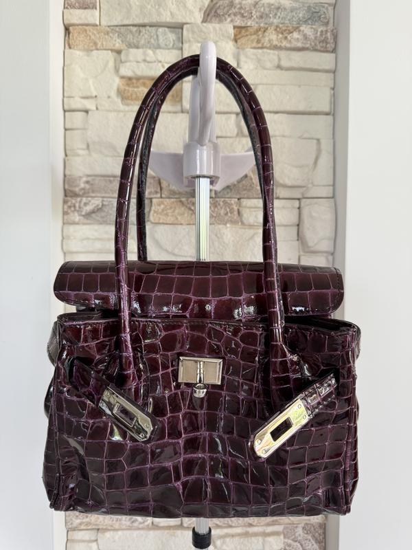 Маленька шкіряна італійська сумочка під крокодила бордового кольору в стилі Kelly. Якісна лакована шкіра з тисненням бордово-бузкового кольору. Одне відділення розділене центральною кишенею на блискавці та кишені на стінках для дрібниць. ЗАМІРИ: висота 19, дно 24*9, ручки 50 СКЛАД: Натуральна лакована шкіра з тисненням СТАН: нової ➖➖➖➖➖➖➖➖➖ Речі в наявності👗🧥👠 Фото на собі не роблю. 🙅♀️ Відправка: НП, Укрпошта📦 Всю необхідну інформацію надам😊 Перегляньте інші мої оголошення та об’єднайте їх із спеціальною знижкою.🫶