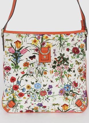 Зовнішня частина з текстильного полотна кольору слонової кістки з принтом «Флора»; оздоблення з гладкої шкіри помаранчевого кольору; регульований плоский плечовий ремінь; фурнітура блідо-золотистого кольору, включаючи зовнішні D-подібні кільця; застібка-блискавка зверху на основне відділення; внутрішня підкладка з нейлону шоколадно-коричневого кольору з 1 кишенею на блискавці та 1 накладною кишенею. Стан майже ідеальний