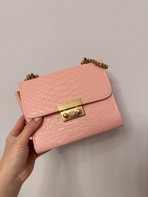 Сумка рожева на цепочці, може бути довга, можна скласти удвоє. Сама цепочка трохи потемнівша, в іншому сумка в ідеалі. Розміри 17 х 14 х 8