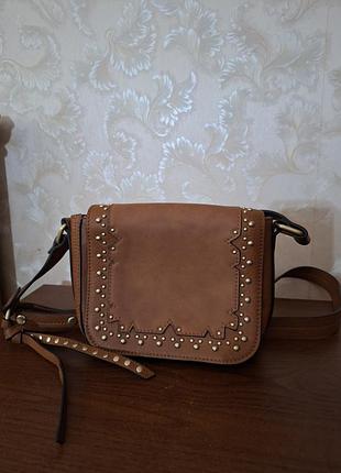 Сумка коричневого кольору, прикрашена заклепками із якісного шкірзаму, застібка на магнитній кнопці, ремінь має регулювання при допомозі кнопок, одне відділення, доволі вмістка. Заміри: ширина 21см., висота 12см., глубина 5,5см, довжина ремня 107/104см. Стан дуже гарний.