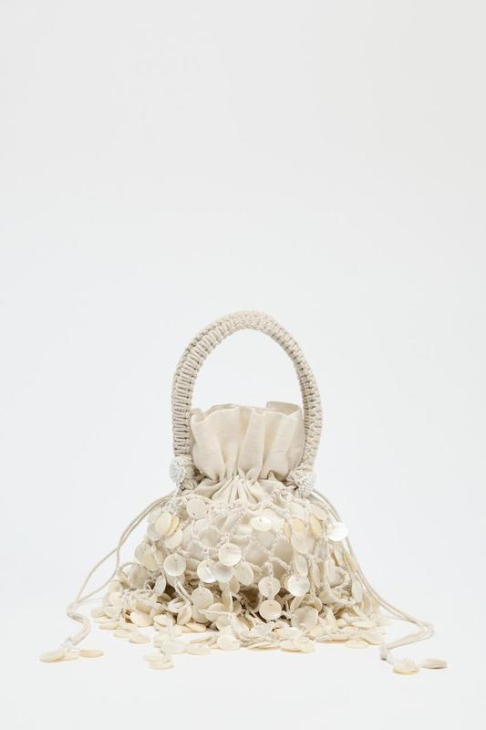 Сумка с перламутровыми аппликациями. Две ручки. Внутренняя сумочка, застегивающаяся путем затяжки шнурков. Высота x длина x ширина: 12 x 15 x 7 см.