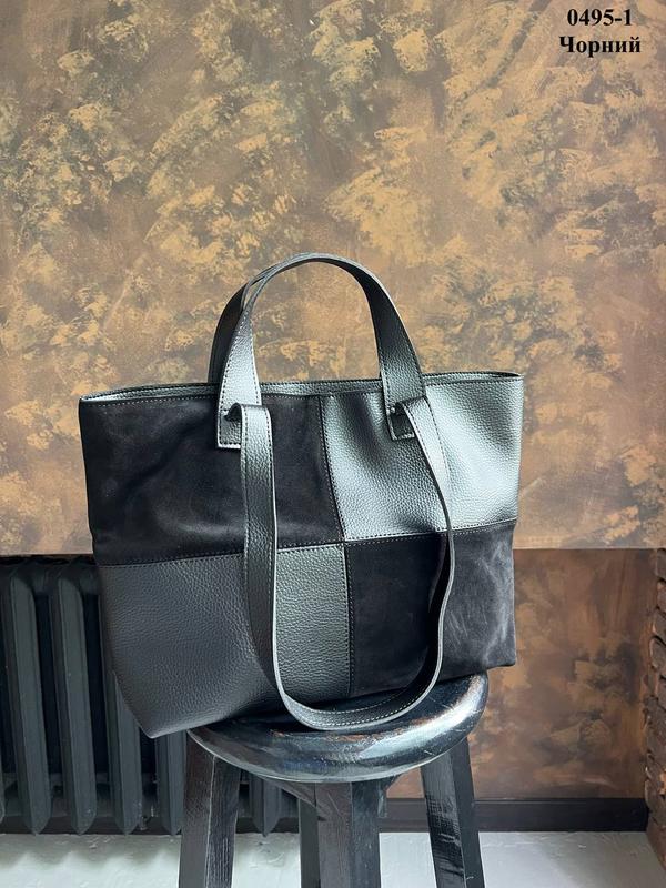 Женская стильная и качественная сумка шоппер из натуральной замши и эко кожи черная