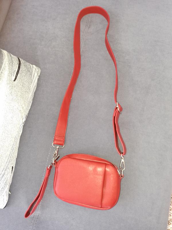 состояние новой, размер 17/12, можно под телефон, имеет кошеньку впереди. Ремень и ручка петелька, прочная сумочка. Цвет спокойный красный, камера не показала реально. Имеет небольшую царапинку на ремне, не заметно сразу.